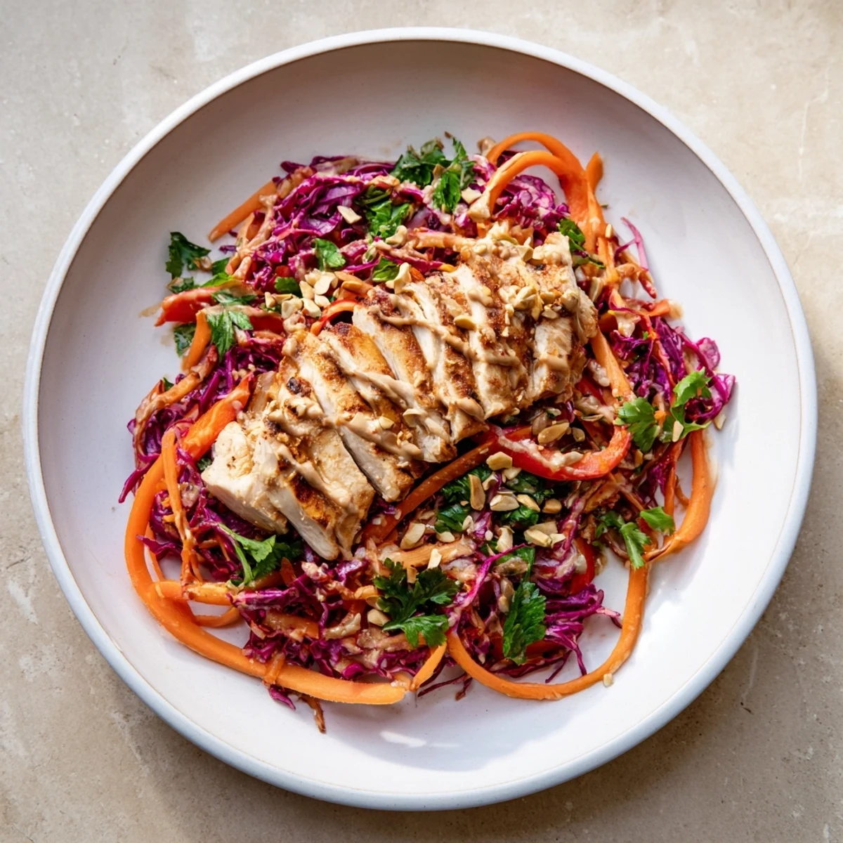 - Slice the rested chicken thinly against the grain, add it to the bowl of vegetables, and pour the dressing over everything. Toss gently with your hands or tongs so every ribbon and slice gets a little coating without bruising the cilantro.