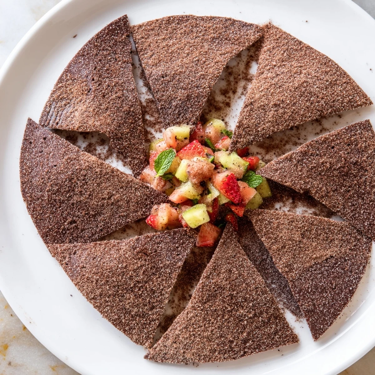 Save A playful, sweet twist on the classic appetizer crispy homemade chocolate tortilla chips served with a vibrant, refreshing fruit salsa. Perfect for parties or as an inventive finish to any meal.