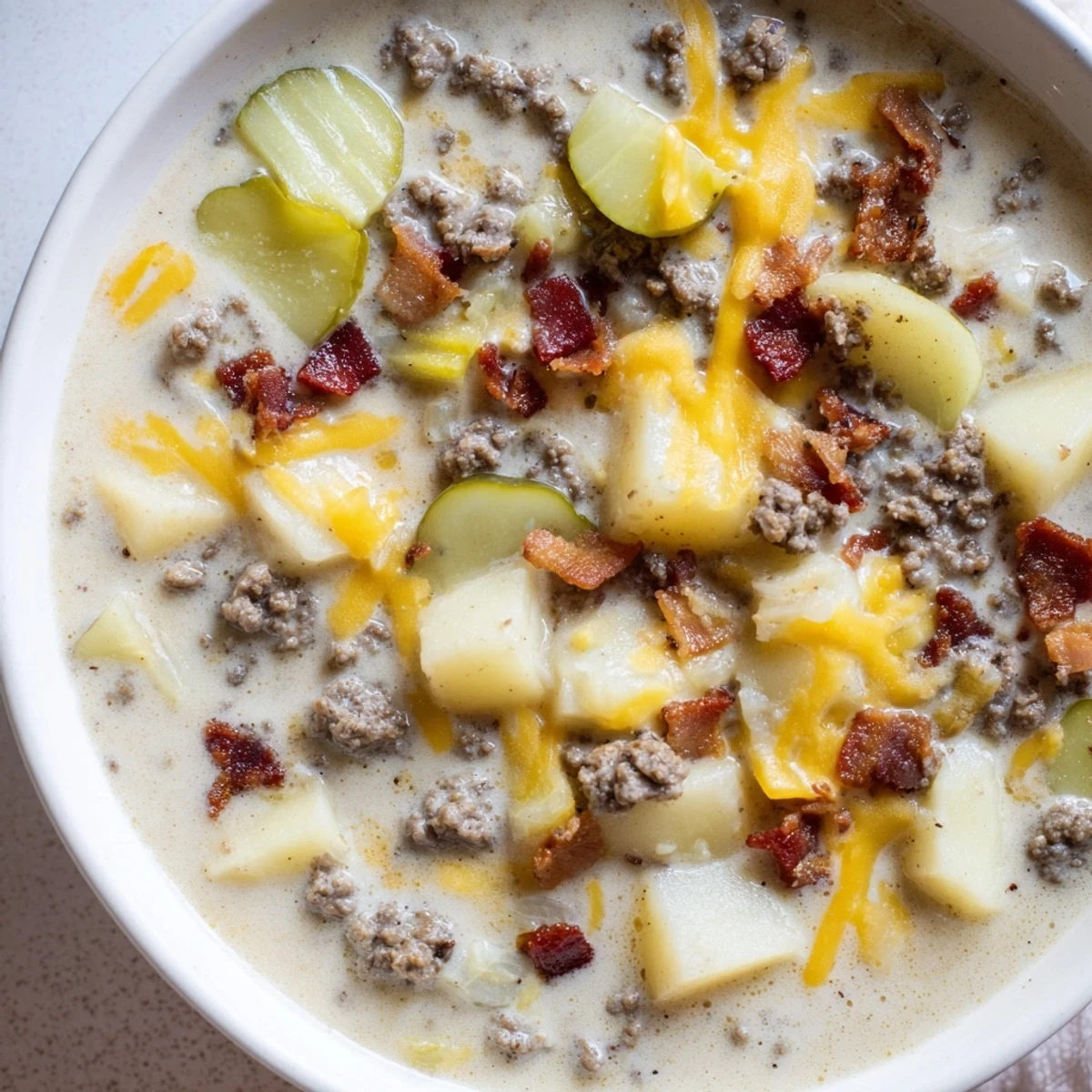 Save A cozy, hearty soup that tastes just like your favorite cheeseburger—loaded with savory beef, melty cheddar, tender potatoes, and smoky bacon. The crockpot makes this easy and perfect for busy weeknights. Top with pickles or tomatoes for a classic cheeseburger finish.