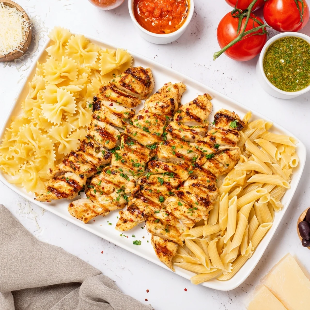 - Spread the three pastas in loose piles on a big platter leaving space between them for the chicken and bowls. Tuck the grilled chicken strips along one side and nestle small bowls of sauce around the edges so everything is within easy reach.
