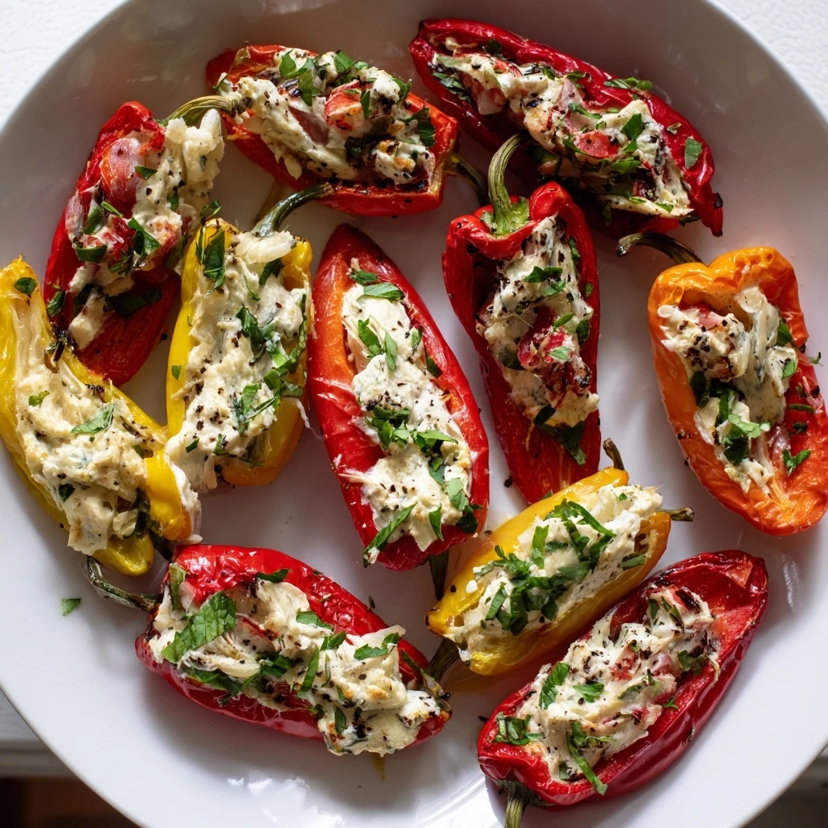 Bright, colorful mini bell peppers filled with a creamy, herbed feta mixture—perfect as a fresh, crowd-pleasing appetizer.