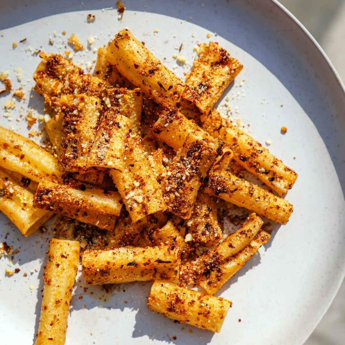 Save Crispy baked pasta chips tossed with a flavorful blend of seasonings, perfect for snacking or serving with dips.