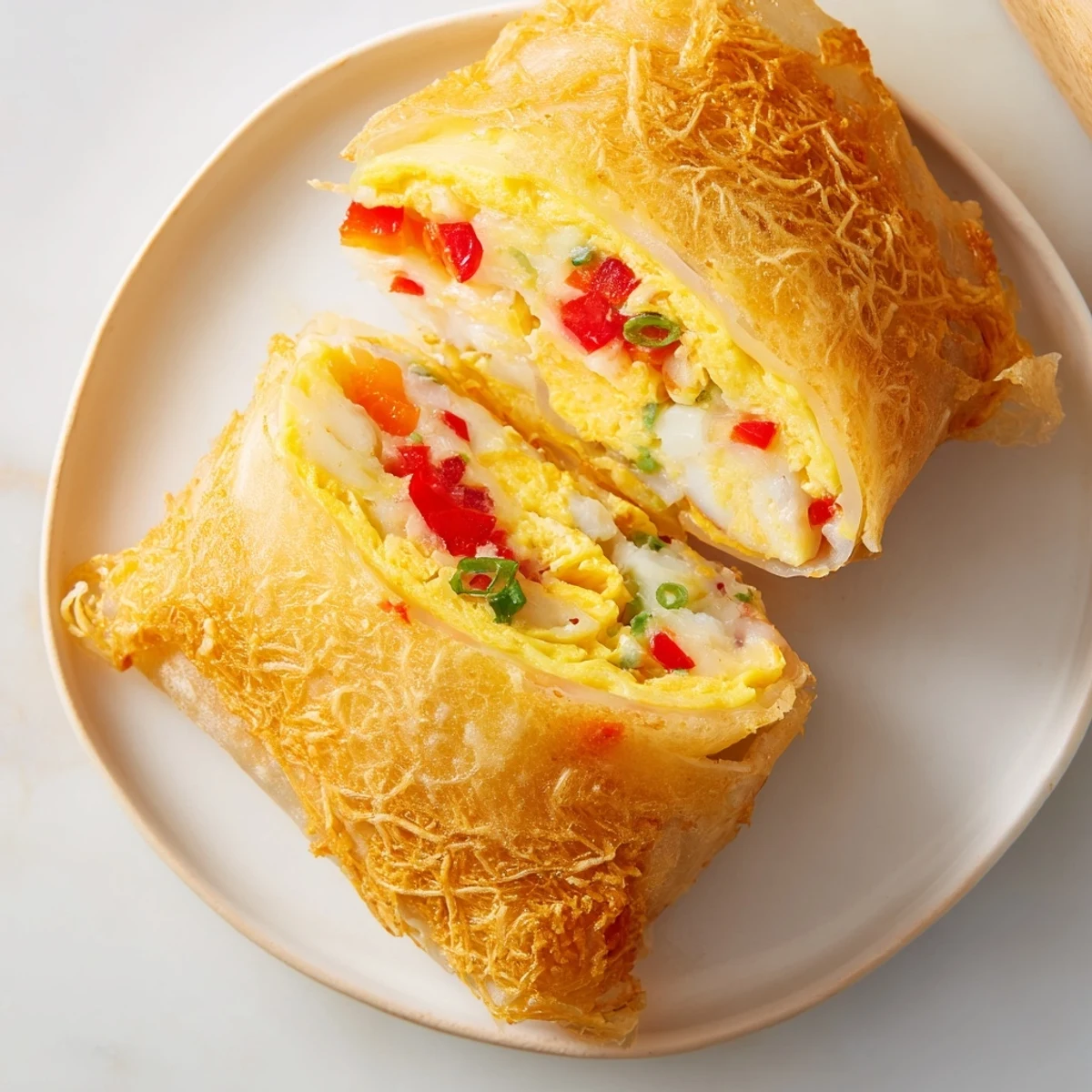 I made these for my roommate on a Thursday when she mentioned she was tired of her usual toast-and-eggs routine. She watched skeptically as the rice paper turned translucent in the pan, then actual gold at the edges. When I slid the crispy wrap onto her plate and she bit into that contrast of tender egg and shatteringly crisp exterior, her whole expression changed. She asked me to make them again the next morning, which is the highest compliment breakfast food can receive.