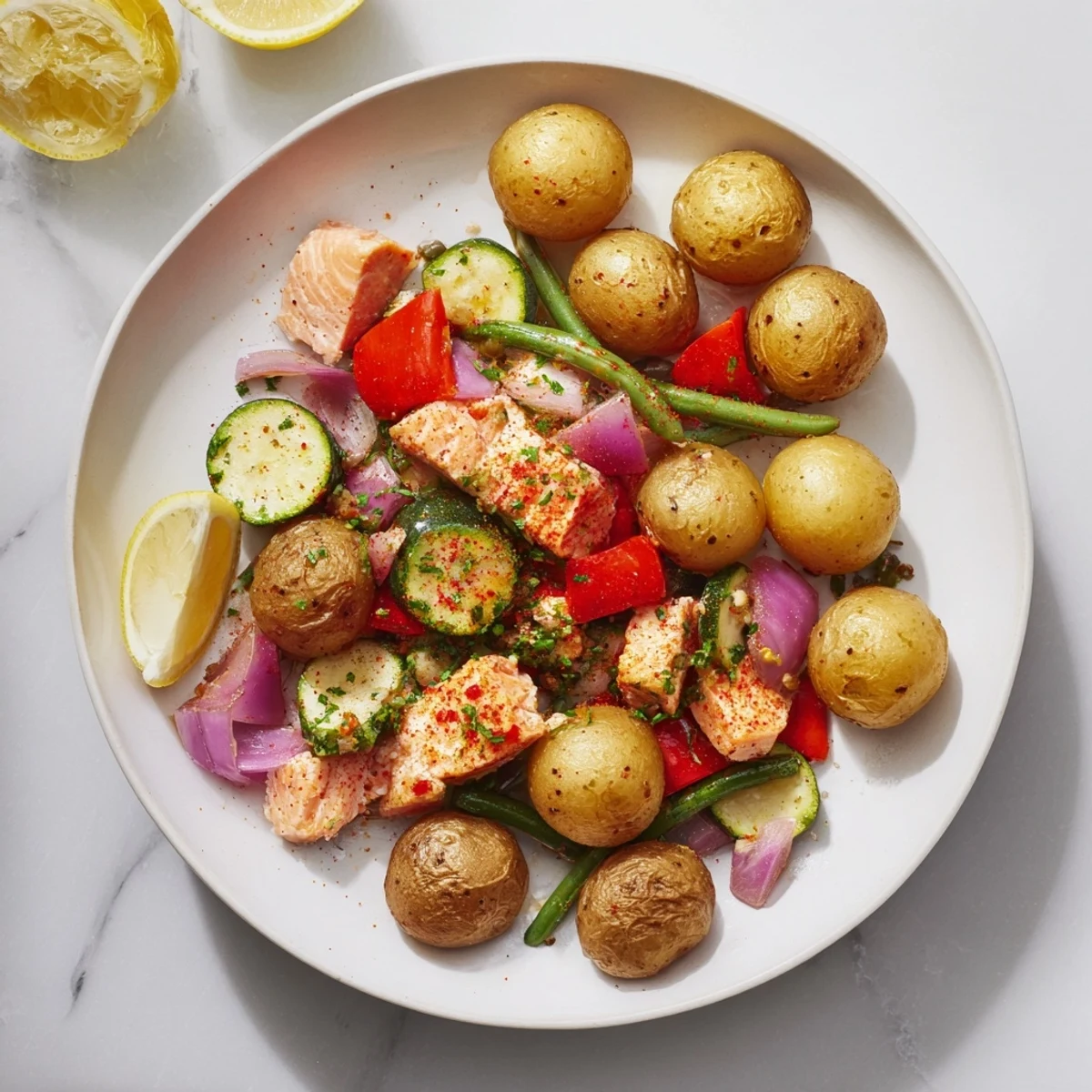 Save A flavorful one-pan meal featuring tender salmon pieces, golden potatoes, and vibrant vegetables, perfect for stretching a smaller portion of salmon into a satisfying, balanced dish.