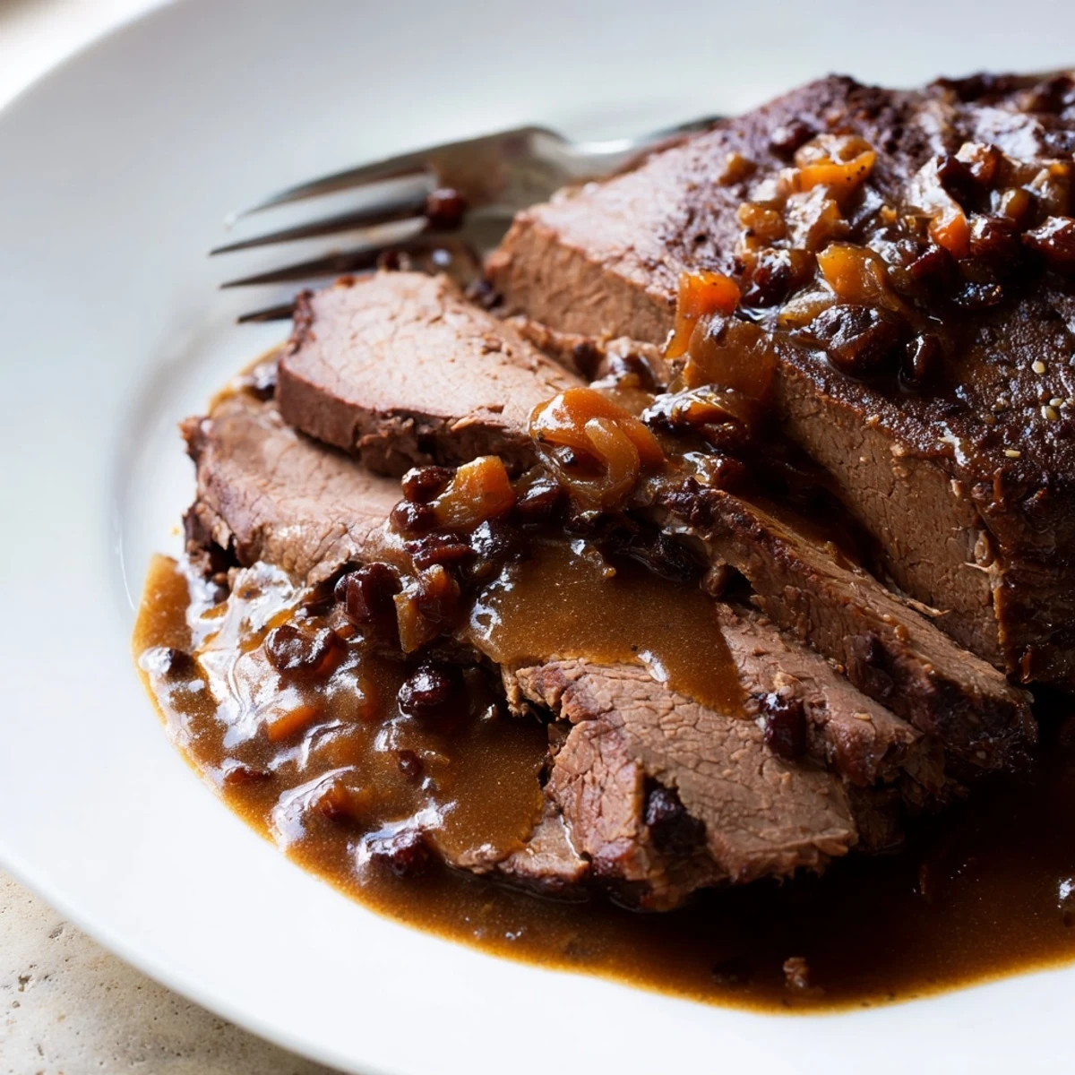 Save Sauerbraten Style Pot Roast is a celebration of traditional German flavors brought to life through slow cooking and a beautifully balanced marinade. This classic main dish combines the tang of red wine vinegar and wine with a hint of sweetness, simmering the beef until it melts tender. The aromatic gravy, enriched with raisins and crushed ginger snaps, offers a unique touch that perfectly complements the rich meat. Patience is key here, with a marinating time that deepens the flavor and a slow cook that transforms the chuck roast into a hearty meal that warms the soul.
