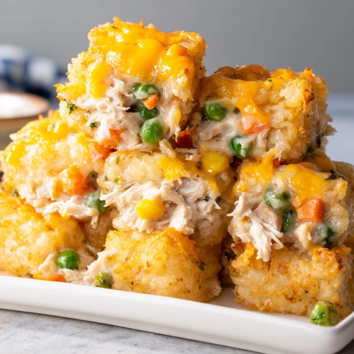 Save A comforting twist on the classic chicken pot pie, topped with crispy tater tots instead of pastry. Budget-friendly, hearty, and perfect for family dinners.