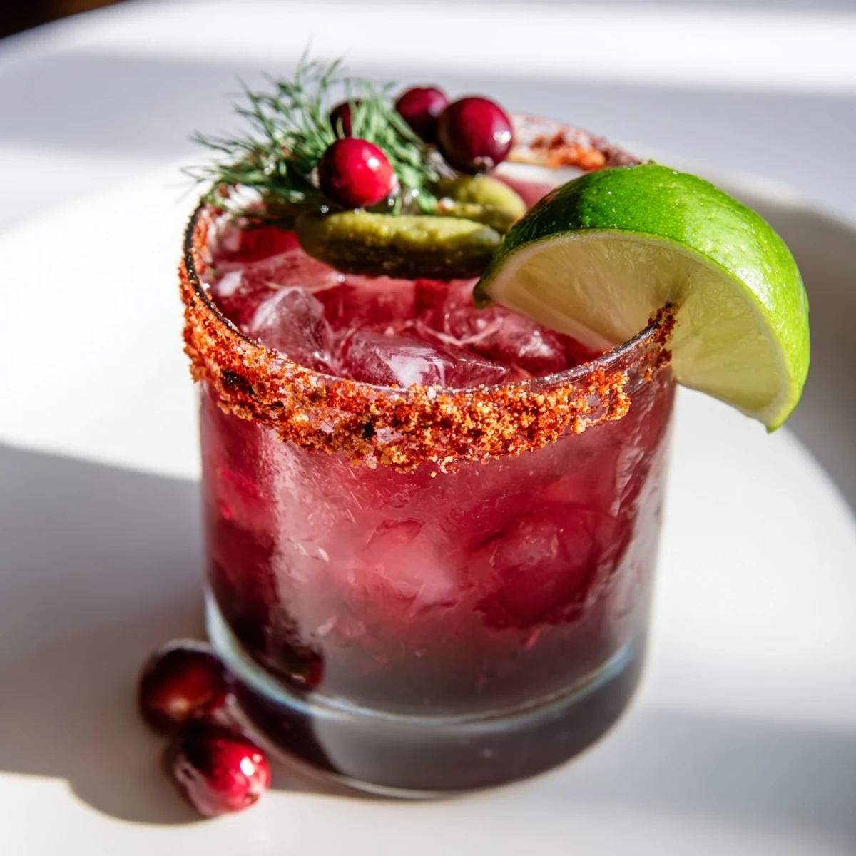 Lime wheels, dill pickle spears, and optional fresh cranberries add color, aroma, and texture, complementing the drink’s layered flavors.