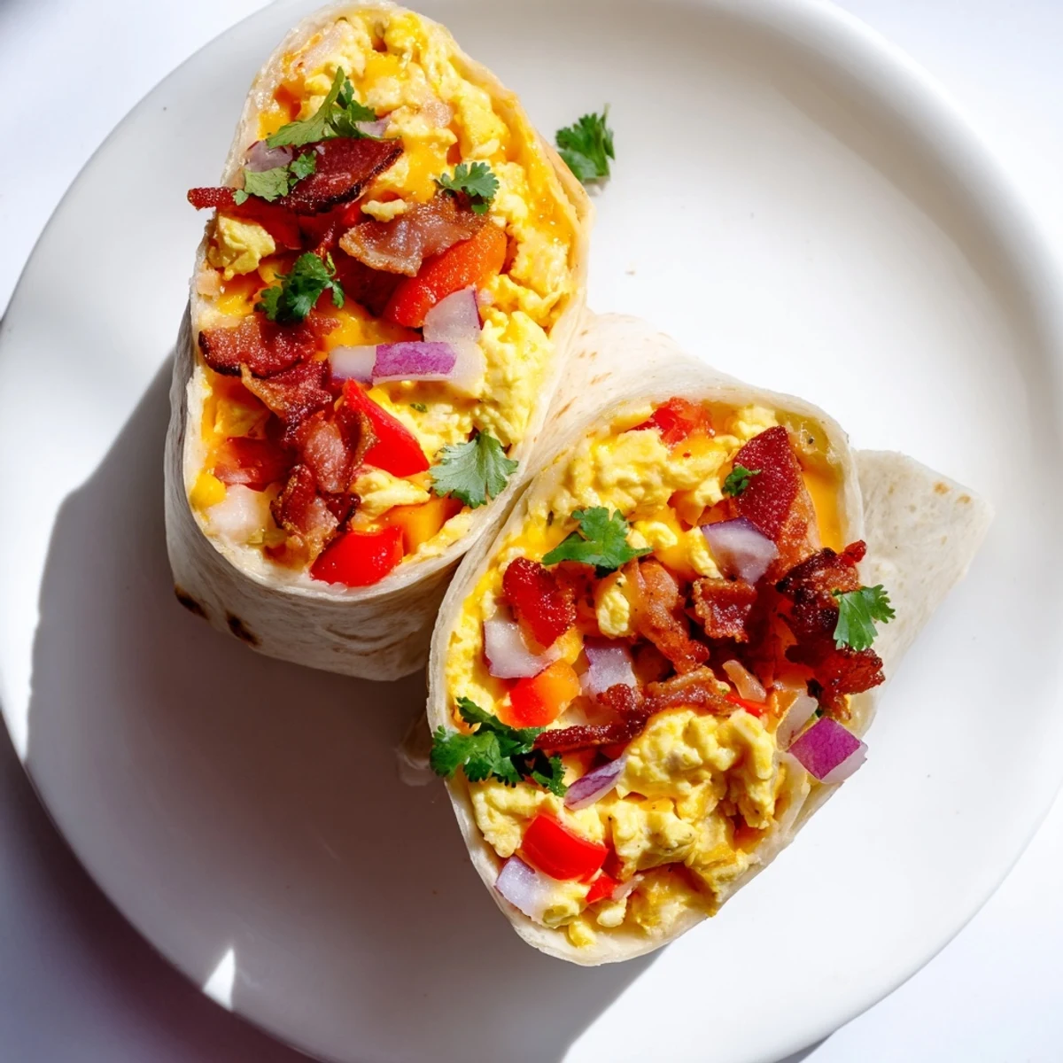 Save A hearty and flavorful breakfast burrito packed with smoky bacon, fluffy scrambled eggs, sharp cheddar cheese, and fresh vegetables, all wrapped in a warm tortilla—the perfect start to your day.